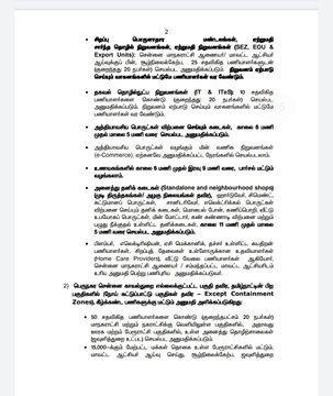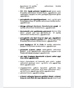 SEZ, EOU, தொழிற் நகரியங்கள் மற்றும் தொழிற்பேட்டைகள் (ஊரக நகரம்) 50 % பணியாளர்களை கொண்டு செயல்பட அனுமதி. நகர பகுதிகளில் உள்ள தொழிற்பேட்டைகள், ஜவுளித்துறை நிறுவனங்கள் இயங்க அனுமதி இல்லை.