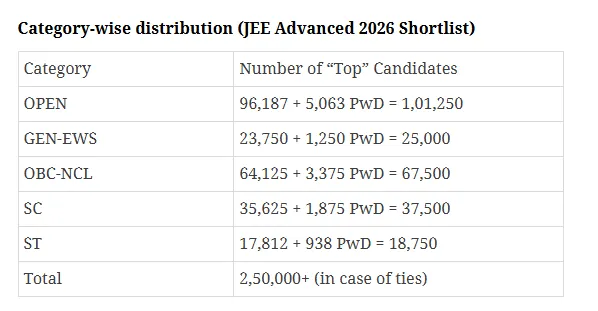 மேலும், இந்தப் பிரிவுகள் ஒவ்வொன்றிலும், PwD (மாற்றுத்திறனாளி) மாணவர்களுக்கு 5% இட ஒதுக்கீடு (Horizontal Reservation) உண்டு. 'சம மதிப்பெண்கள்' (tied ranks) காரணமாக, மொத்த எண்ணிக்கை 2.5 லட்சத்தை விட சற்றே அதிகமாக இருக்கக்கூடும் என்றும் ஐ.ஐ.டி ரூர்க்கி தெளிவுபடுத்தியுள்ளது.
