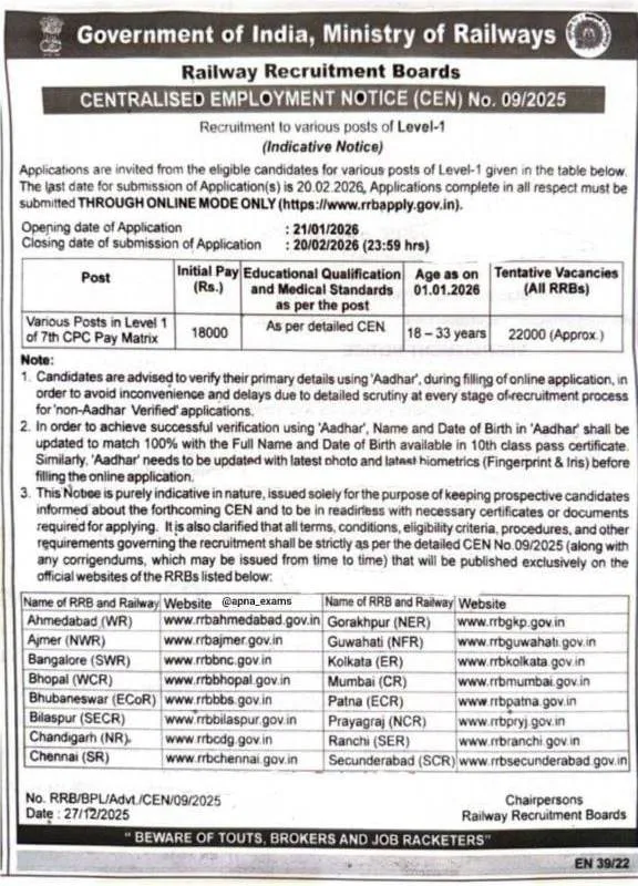 RRB Group D 2026 Jobs: இந்திய ரயில்வேயில் குரூப் டி பணியிடங்களை நிரப்புவதற்கான வேலைவாய்ப்பு அறிவிப்பு வெளியாகி உள்ளது. இந்த அறிவிப்பு மூலம் நாடு முழுவதும் 22000 இடங்கள் நிரப்பப்பட உள்ளன.